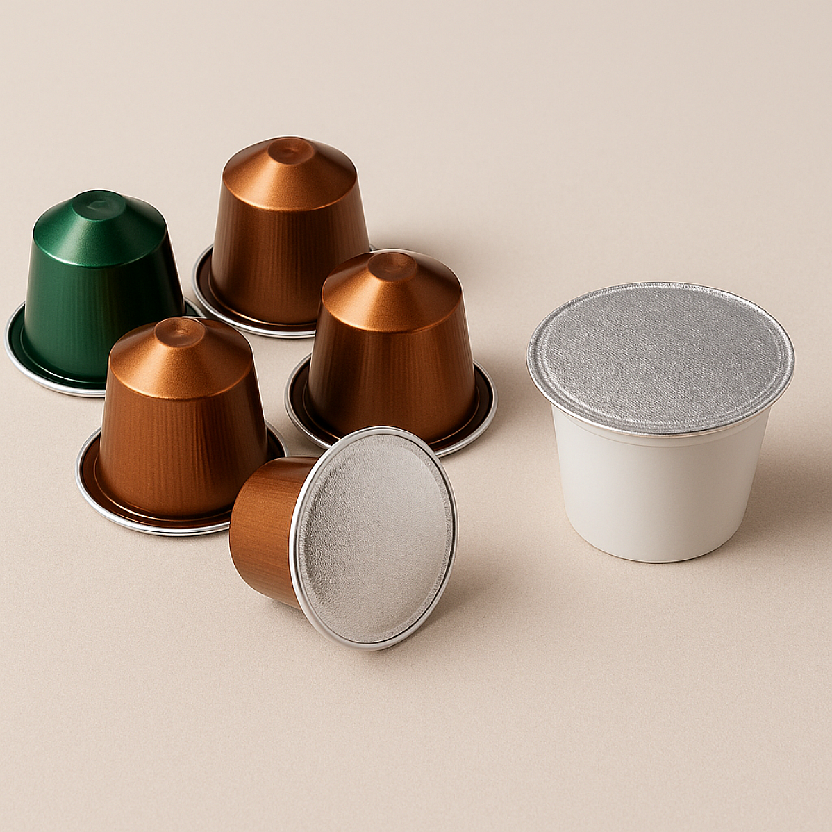 En cambio, las cápsulas Nespresso suelen estar hechas completamente de aluminio (incluyendo el vaso de aluminio y la tapa de aluminio), sin filtro de papel. Las cápsulas Nespresso suelen ser más pequeñas que las K-Cup y varían en forma y capacidad según la línea de productos. Por ejemplo, las cápsulas de la Línea Original de Nespresso son pequeñas cápsulas de aluminio con forma de taza para espressos individuales (contienen entre 5 y 6 gramos de café), mientras que las cápsulas de la Línea Vertuo son cápsulas de aluminio más anchas y con forma de cúpula que pueden contener mayores cantidades de café (desde unos 7 gramos hasta unos 12 gramos o más para preparaciones más abundantes).